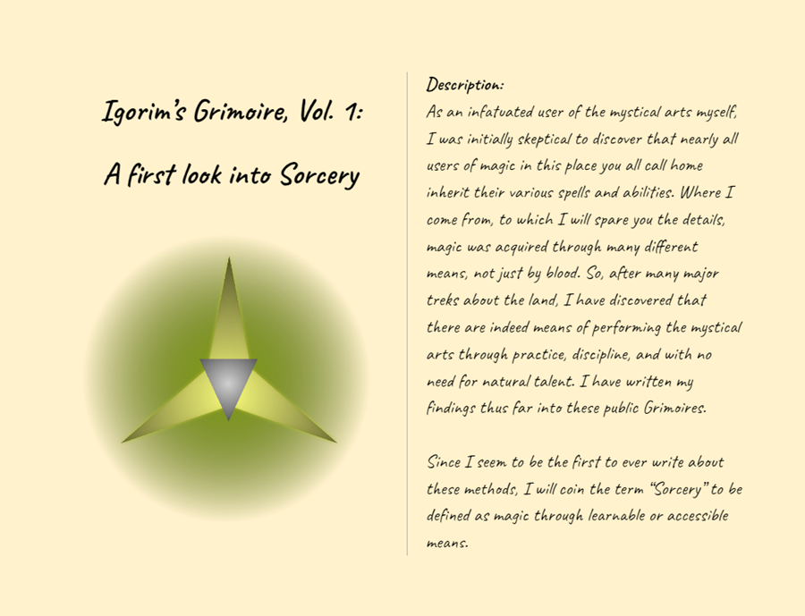 Similar to the Mythical Magic system seen previously, this series of Grimoires was meant to provide an audience with a way to customize and acquire magic within this public community project. However, this system revolved around investing time to learn and train in mystical arts rather than simply having the magic within one’s genetics. The tomes revolve around the findings and experiences of the author: one Igorim Alcaus. He was a recurring character during Volterra’s run.